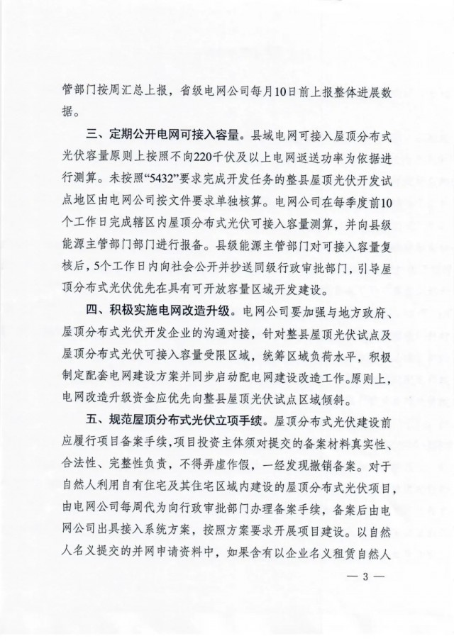 定期公開電網(wǎng)可接入容量。縣域電網(wǎng)可接入屋頂分布式 光伏容量原則上按照不向220千伏及以上電網(wǎng)返送功率為依據(jù)進(jìn)行測算。未按照“5432”要求完成開發(fā)任務(wù)的整縣屋頂光伏開發(fā)試點(diǎn)地區(qū)由電網(wǎng)公司按文件要求單獨(dú)核算。