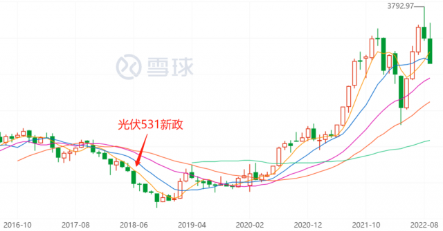 光伏產(chǎn)業(yè)的強(qiáng)勢并非從一而終,最近一次市場記憶猶新的渡劫是,由于發(fā)電成本總是居高不下,在產(chǎn)業(yè)補(bǔ)貼退坡(531新政)后,市場一度對(duì)光伏產(chǎn)業(yè)的未來充滿疑慮,上市公司的整體估值跌至歷史低點(diǎn)。