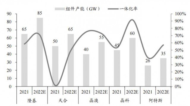 圖:組件龍頭組件產(chǎn)能及一體化率對(duì)比(GW,%),來源:CPIA,東吳證券研究所