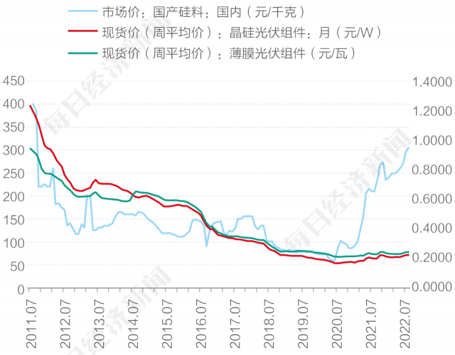 2011年7月開始下行以來,至2022年7月國產硅料價格走出一條V形線,11年過去,還未達到當時的價格水平 圖片來源:每經記者 劉國梅 制圖