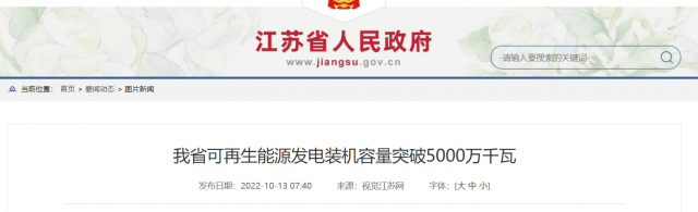 截至2022年10月11日,江蘇省可再生能源發(fā)電總裝機突破5000萬千瓦,達到5109萬千瓦,其中風電2247萬千瓦,光伏2277萬千瓦,生物質(zhì)295萬千瓦,抽水蓄能260萬千瓦,儲能30萬千瓦。