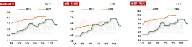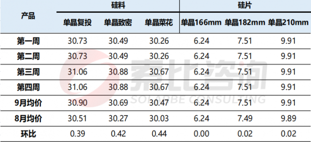 根據(jù)索比咨詢(xún)對(duì)多家電池片制造商的調(diào)研:就9月硅片價(jià)格行情來(lái)看,單晶166mm均價(jià)6.24元/片,較9月環(huán)比持平;單晶182mm均價(jià)漲至7.51元/片,較8月環(huán)比上漲0.27%;單晶210mm均價(jià)漲至9.91元/W,較8月環(huán)比上升0.20%。