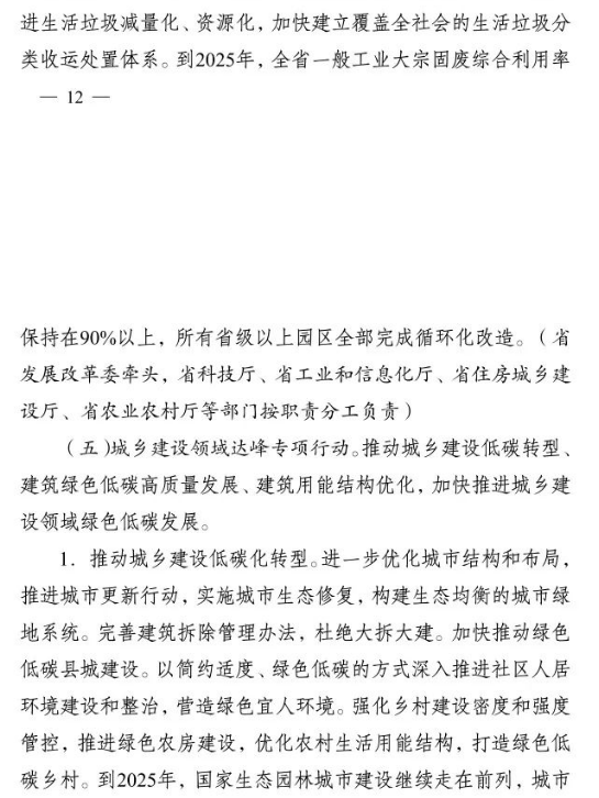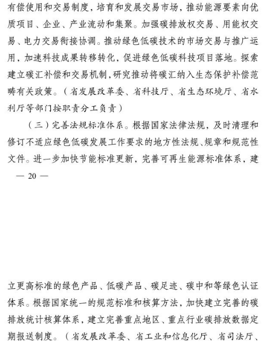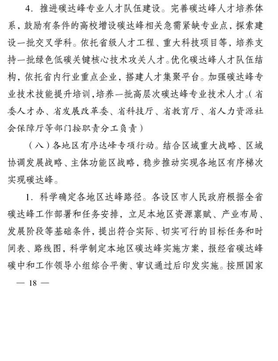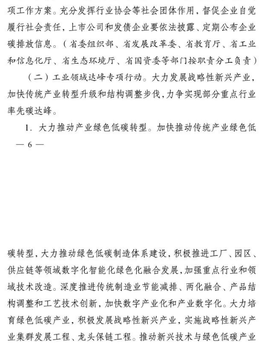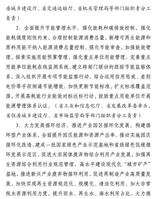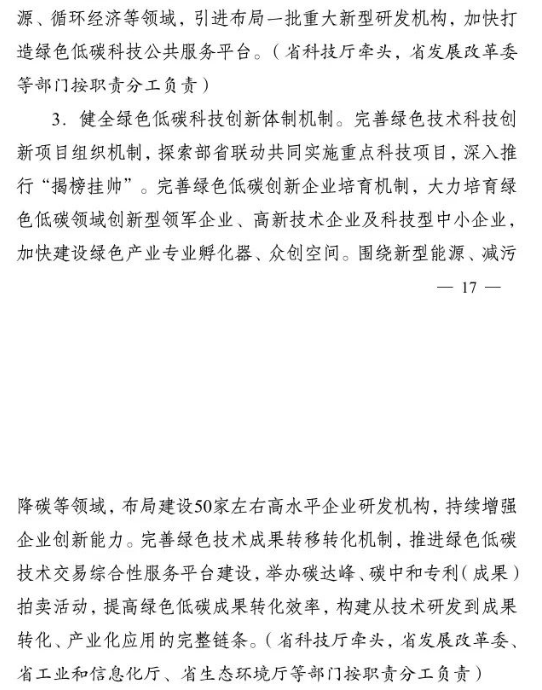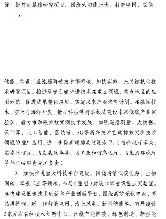 加快推進重大科技平臺建設(shè)。圍繞清潔低碳能源、生物固碳、零碳工業(yè)等領(lǐng)域,布局(重組)建設(shè)10家省級重點實驗室。加快建設(shè)低碳技術(shù)創(chuàng)新和產(chǎn)業(yè)創(chuàng)新平臺,圍繞高效光伏電池、高品質(zhì)特鋼、新一代智能電網(wǎng)、海上風(fēng)電、新型儲能等,布局建設(shè)5家左右省級技術(shù)創(chuàng)新中心。圍繞節(jié)能降碳、綠色制造、新型能源、循環(huán)經(jīng)濟等領(lǐng)域,引進布局一批重大新型研發(fā)機構(gòu),加快打造綠色低碳科技公共服務(wù)平臺。