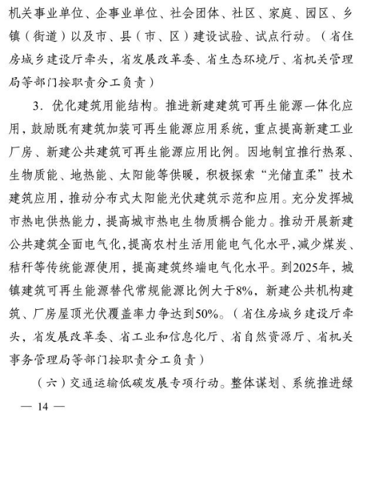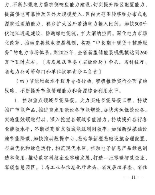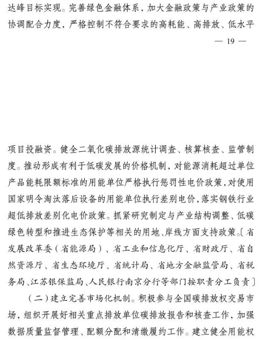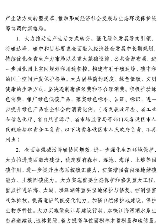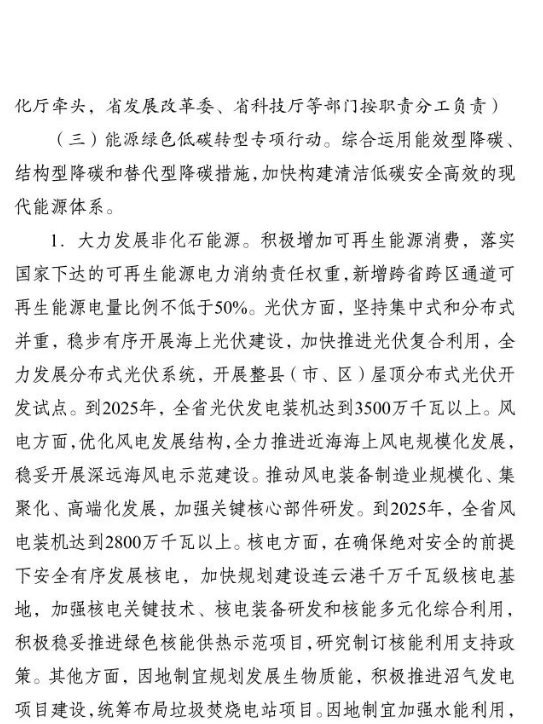 10月2日,江蘇省人民政府印發(fā)《江蘇省碳達峰實施方案》。文件提出,大力發(fā)展非化石能源。積極增加可再生能源消費,落實國家下達的可再生能源電力消納責(zé)任權(quán)重,新增跨省跨區(qū)通道可再生能源電量比例不低于50%.光伏方面,堅持集中式和分布式并重,穩(wěn)步有序開展海上光伏建設(shè),加快推進光伏復(fù)合利用,全力發(fā)展分布式光伏系統(tǒng),開展整縣(市、區(qū))屋頂分布式光伏開發(fā)試點。到2025年,全省光伏發(fā)電裝機達到3500萬千瓦以上。風(fēng)電方面,優(yōu)化風(fēng)電發(fā)展結(jié)構(gòu),全力推進近海海上風(fēng)電規(guī)?;l(fā)展,穩(wěn)妥開展深遠海風(fēng)電示范建設(shè)。推動風(fēng)電裝備制造業(yè)規(guī)模化、集聚化、高端化發(fā)展,加強關(guān)鍵核心部件研發(fā)。到2025年,全省風(fēng)電裝機達到2800萬千瓦以上。核電方面,在確保絕對安全的前提下安全有序發(fā)展核電,加快規(guī)劃建設(shè)連云港千萬千瓦級核電基地,加強核電關(guān)鍵技術(shù)、核電裝備研發(fā)和核能多元化綜合利用,積極穩(wěn)妥推進綠色核能供熱示范項目,研究制訂核能利用支持政策。其他方面,因地制宜規(guī)劃發(fā)展生物質(zhì)能,積極推進沼氣發(fā)電項目建設(shè),統(tǒng)籌布局垃圾焚燒電站項目。因地制宜加強水能利用,科學(xué)推進抽水蓄能開發(fā)。大力推進光熱能、地?zé)崮?、空氣熱能等可再生能源的非電化利用,加快推動氫能研究與推廣應(yīng)用。力爭到2025年底全省生物質(zhì)發(fā)電裝機規(guī)模達到300萬千瓦。