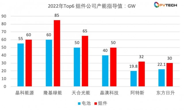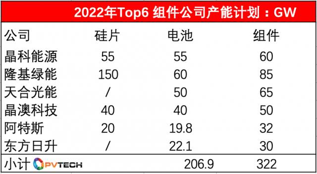 而根據(jù)晶科、隆基、天合、晶澳、阿特斯、東方日升 2022中報(bào)披露的數(shù)據(jù),到2022年底,各家組件規(guī)劃產(chǎn)能分別為60GW、85GW、65GW、50GW、32GW、30GW,這六 家公司2022 年底組件產(chǎn)能將達(dá)到322 GW,數(shù)值驚人。