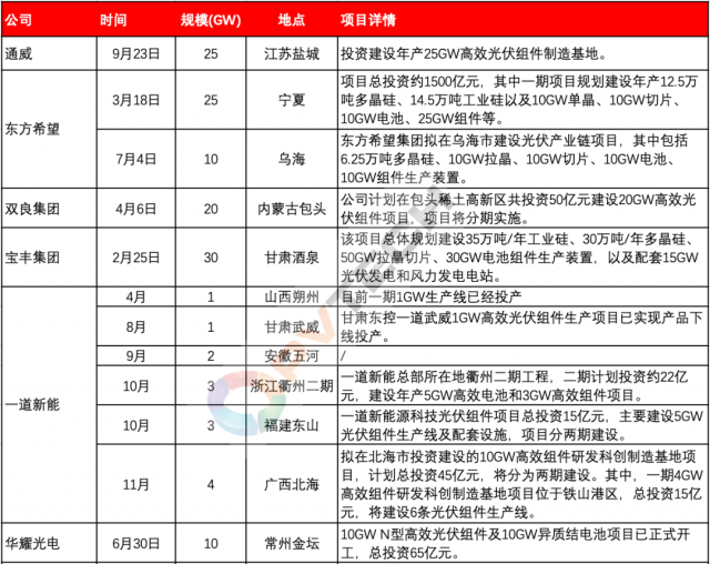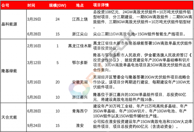 今年以來(lái),以晶科能源、隆基綠能、天合光能、晶澳科技等為代表的行業(yè)第一梯隊(duì)主流組件大廠為鞏固各自市場(chǎng)地位、把握行業(yè)發(fā)展帶來(lái)的市場(chǎng)機(jī)遇,均在積極投資新建組件產(chǎn)能。