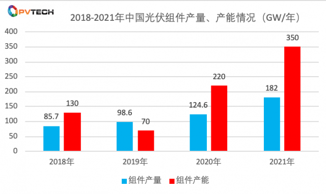 中國(guó)光伏行業(yè)協(xié)會(huì)(CPIA)數(shù)據(jù)顯示,2021年中國(guó)光伏組件產(chǎn)能為350 GW/年,同比增59.09%;該年實(shí)際組件產(chǎn)量為182GW,同比2020年增46.07%。