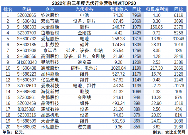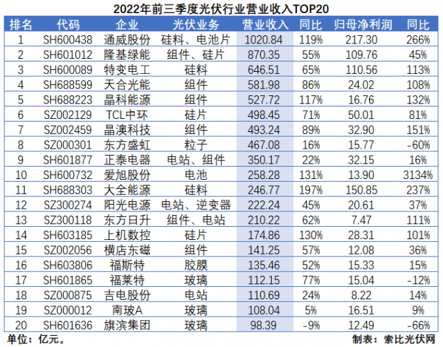 從營(yíng)收規(guī)模來(lái)看,硅料和組件依然是創(chuàng)收能力最強(qiáng)的環(huán)節(jié)。而且,多數(shù)企業(yè)前三季度營(yíng)業(yè)收入均已超過(guò)2021年全年,且創(chuàng)歷史新高。其中,通威股份營(yíng)收規(guī)模首次突破千億大關(guān),達(dá)到1021億元;隆基綠能二、三季度邊際改善顯著,環(huán)比增速分別達(dá)到71%和15%,營(yíng)收規(guī)模達(dá)到870.35億元;特變電工受益于硅料、煤炭產(chǎn)品的“量?jī)r(jià)齊升”,達(dá)到646.51億元。