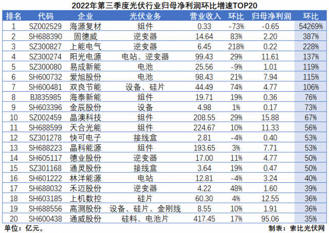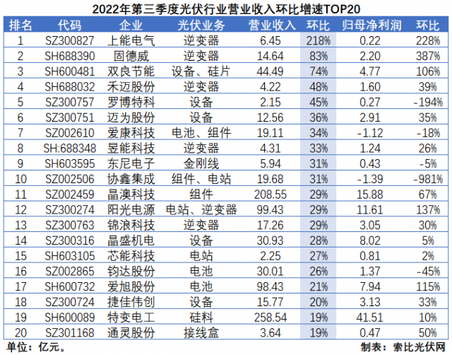 從環(huán)比增速來(lái)看,逆變器環(huán)節(jié)受益于歐洲戶用儲(chǔ)能市場(chǎng)的全面爆發(fā),第三季度經(jīng)營(yíng)業(yè)績(jī)持續(xù)攀升。其中,上能電氣營(yíng)收和歸母凈利潤(rùn)環(huán)比增速高達(dá)218%和228%;固德威達(dá)到83%和387%;陽(yáng)光電源為29%和137%。