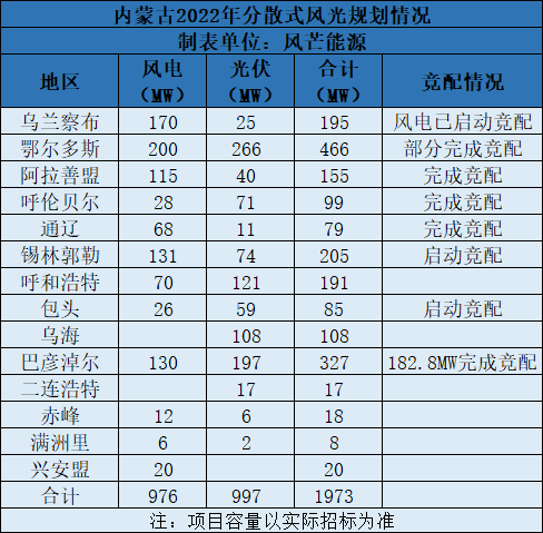 2021年6月,內(nèi)蒙古印發(fā)《內(nèi)蒙古自治區(qū)分散式風(fēng)電、分布式光伏發(fā)電項(xiàng)目三年行動(dòng)計(jì)劃(2021~2023年)》顯示,2022年內(nèi)蒙古規(guī)劃分散式風(fēng)光容量為1.973GW,其中風(fēng)電976MW,光伏997MW。