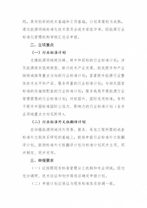 為進(jìn)一步提升能源行業(yè)標(biāo)準(zhǔn)立項工作的計劃性、導(dǎo)向性,根據(jù)國家能源局標(biāo)準(zhǔn)化工作安排,結(jié)合落實《能源碳達(dá)峰碳中和標(biāo)準(zhǔn)化提升行動計劃》重點任務(wù),我局組織編制了《2023年能源行業(yè)標(biāo)準(zhǔn)計劃立項指南》。現(xiàn)印發(fā)給你們,請按照指南明確的要求,做好能源行業(yè)標(biāo)準(zhǔn)計劃立項工作。