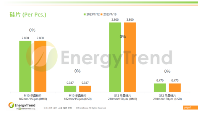M10單晶硅片人民幣報(bào)價(jià)為 RMB2.8/Pc;美金最新報(bào)價(jià)為 US$0.347/Pc。G12單晶硅片人民幣報(bào)價(jià)保持在 RMB3.8/Pc;美金報(bào)價(jià)為 US$0.47/Pc。
