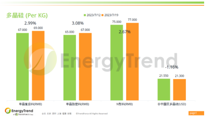 根據(jù)集邦咨詢(xún)旗下新能源研究中心集邦新能源網(wǎng)(EnergyTrend)2023年7月19日的報(bào)價(jià),單晶復(fù)投料人民幣價(jià)格為 RMB69/KG,增幅為 2.99%;單晶致密料人民幣最新價(jià)格為 RMB67/KG,較上周增長(zhǎng)了 3.08%。N型料人民幣報(bào)價(jià)從 RMB75/KG 增長(zhǎng)至 RMB77/KG,漲幅為 2.67%。非中國(guó)區(qū)多晶硅料美金價(jià)格為 US$21.3/KG。