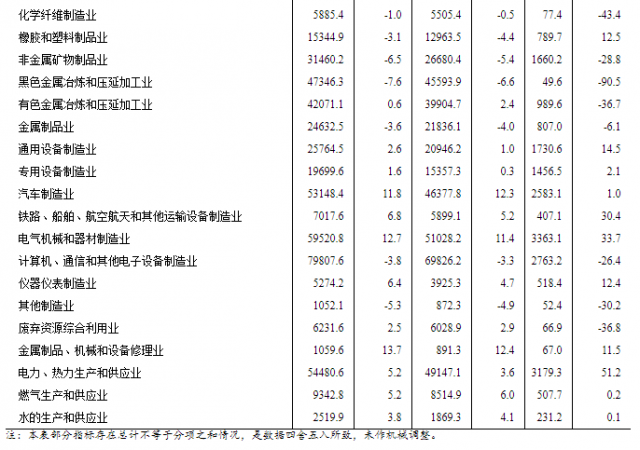 1—7月份,在41個(gè)工業(yè)大類行業(yè)中,13個(gè)行業(yè)利潤總額同比增長,28個(gè)行業(yè)下降。主要行業(yè)利潤情況如下:電力、熱力生產(chǎn)和供應(yīng)業(yè)利潤總額同比增長51.2%,電氣機(jī)械和器材制造業(yè)增長33.7%,通用設(shè)備制造業(yè)增長14.5%,專用設(shè)備制造業(yè)增長2.1%,汽車制造業(yè)增長1.0%,石油和天然氣開采業(yè)下降11.4%,紡織業(yè)下降20.3%,煤炭開采和洗選業(yè)下降26.2%,計(jì)算機(jī)、通信和其他電子設(shè)備制造業(yè)下降26.4%,非金屬礦物制品業(yè)下降28.8%,農(nóng)副食品加工業(yè)下降32.6%,有色金屬冶煉和壓延加工業(yè)下降36.7%,化學(xué)原料和化學(xué)制品制造業(yè)下降54.3%,石油、煤炭及其他燃料加工業(yè)下降87.0%,黑色金屬冶煉和壓延加工業(yè)下降90.5%。