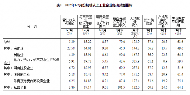 1—7月份,規(guī)模以上工業(yè)企業(yè)實(shí)現(xiàn)營業(yè)收入73.22萬億元,同比下降0.5%;發(fā)生營業(yè)成本62.40萬億元,增長0.2%;營業(yè)收入利潤率為5.39%,同比下降0.95個(gè)百分點(diǎn)。