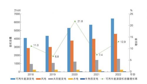 2018-2022年可再生能源裝機容量及年增長率變化對比