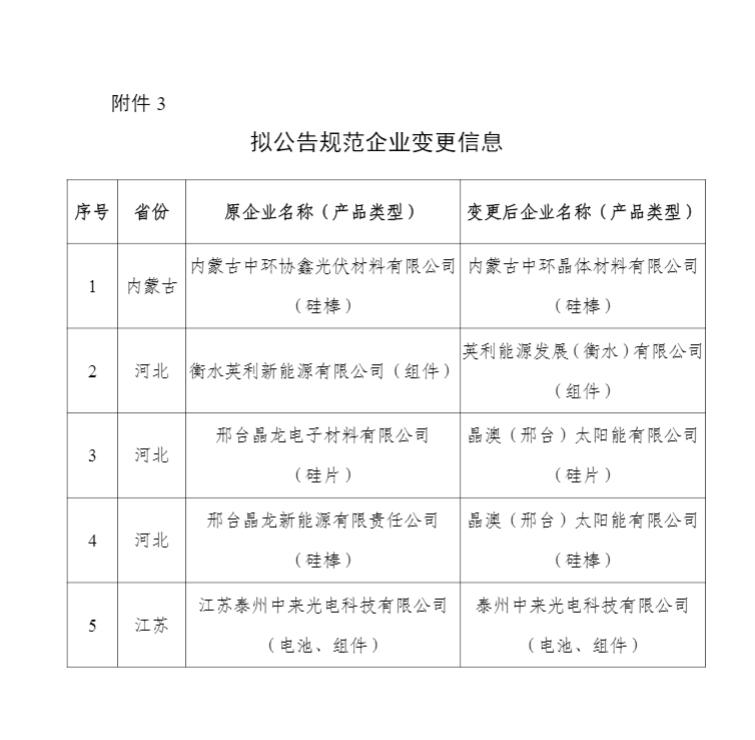 京瓷(天津)太陽能有限公司等14家已公告企業(yè),因不能保持規(guī)范條件要求,擬撤銷其規(guī)范企業(yè)資格(見附件2);內(nèi)蒙古中環(huán)協(xié)鑫光伏材料有限公司等5家企業(yè)名稱發(fā)生變更,擬更新有關(guān)公告信息(詳見附件3),以上信息一并予以公示。