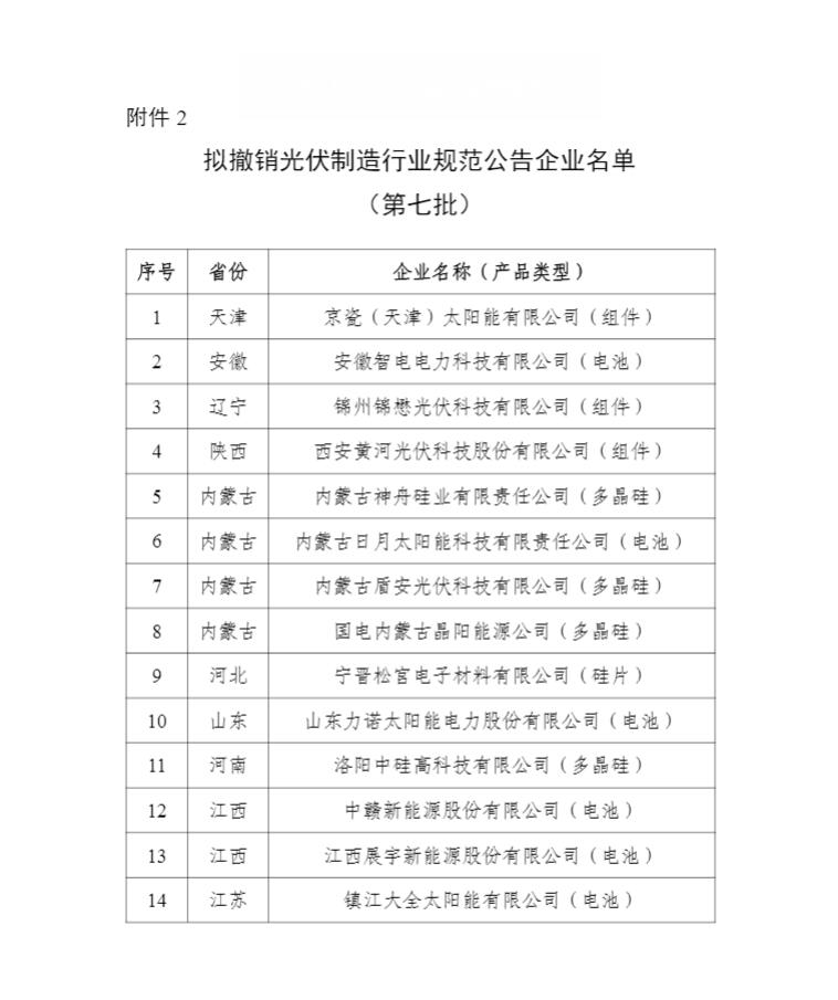 和擬撤銷光伏制造行業(yè)規(guī)范公告企業(yè)名單(第七批)公示