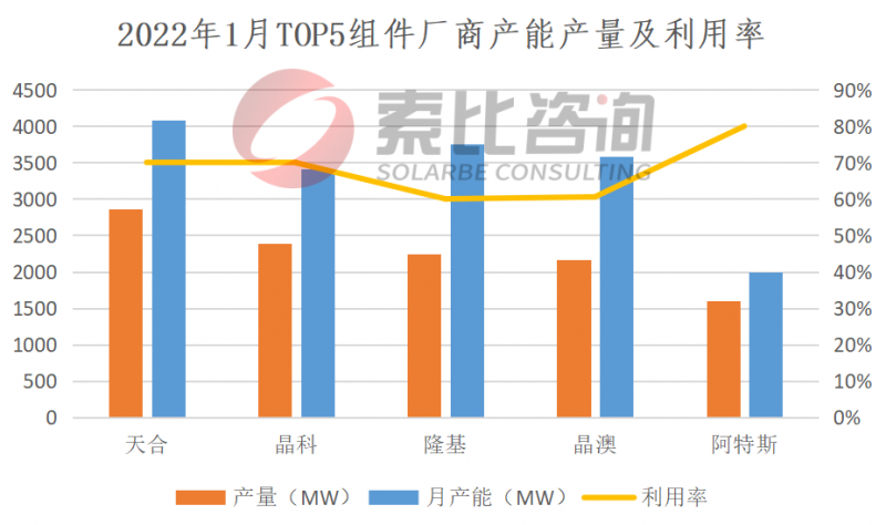 2022年1月,終端需求大幅上升,國內(nèi)組件產(chǎn)量19.73GW,環(huán)比大增23.31%。按照產(chǎn)量排名,天合、晶科、隆基、晶澳、阿特斯位列前五,企業(yè)總產(chǎn)量11.27GW,占比57.12%,綜合開工率68.11%。預(yù)計(jì)2022年2月,海外需求還會(huì)有所提升,組件產(chǎn)量預(yù)計(jì)持平或小幅上漲。