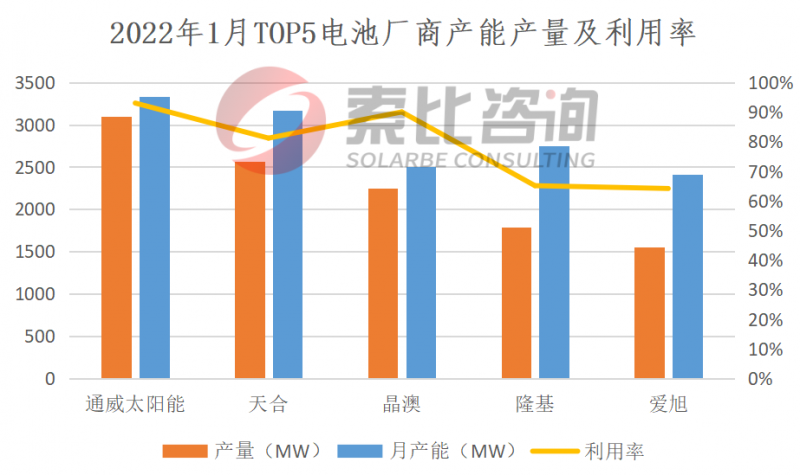 2022年1月,電池需求量明顯增加,國內(nèi)一線企業(yè)開工率提升至7成。2022年1月國內(nèi)硅片產(chǎn)量20.6GW,環(huán)比增加15.4%。按照產(chǎn)量排名,隆基、中環(huán)、晶科、晶澳、上機(jī)位列前五,企業(yè)總產(chǎn)量14.34GW,占比69.61%,綜合利用率70.45%。預(yù)計(jì)2月份硅片產(chǎn)量將繼續(xù)增加。從供應(yīng)端來看,2月份基礎(chǔ)產(chǎn)量已達(dá)上限,受地震影響的部分產(chǎn)能加緊恢復(fù)。從需求端來看,終端需求遠(yuǎn)超預(yù)期、海外市場火熱,市場轉(zhuǎn)向供不應(yīng)求的局面。
