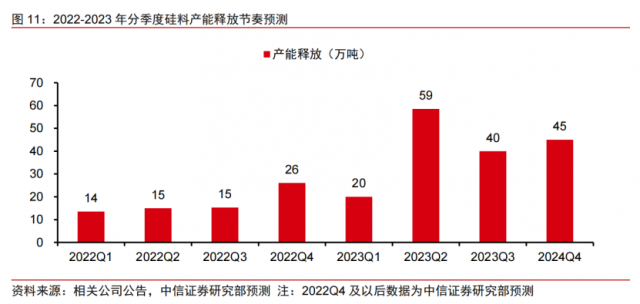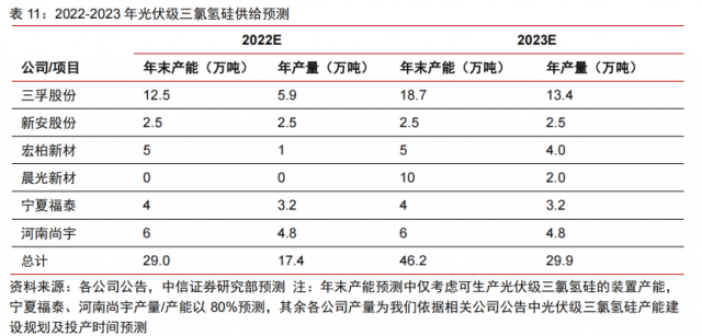 中信證券王喆在10月11日發(fā)布的研報中表示,根據(jù)2022-2023年多晶硅廠家擴產(chǎn)計劃,2022Q4季度與2023Q2季度將迎來硅料產(chǎn)能釋放密集期,可能會存在光伏級三氯氫硅出現(xiàn)短暫的供給缺口,屆時有望提振三氯氫硅價格,預(yù)計三氯氫硅高景氣度有望維持至2023Q2。