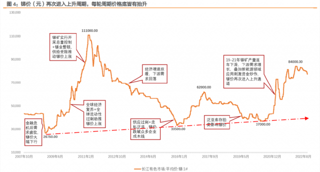 中郵證券還提到,銻可能是2023年有色最亮眼的品種,銻價(jià)有望進(jìn)入強(qiáng)力上漲通道,目前8萬(wàn)/噸,歷史高點(diǎn)是2011年的12萬(wàn),有望創(chuàng)新高。