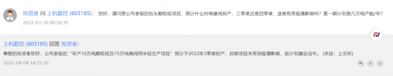 上機(jī)數(shù)控(603185.SH)4月4日在投資者互動(dòng)平臺(tái)表示,公司參股的“年產(chǎn)10萬噸顆粒硅及15萬噸高純納米硅生產(chǎn)項(xiàng)目”預(yù)計(jì)于2022年3季度投產(chǎn),目前項(xiàng)目未受到疫情影響,按計(jì)劃建設(shè)當(dāng)中。