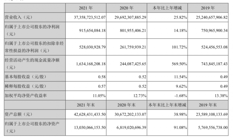 4月12日晚上,欣旺達(dá)公布了2021年的年報(bào)業(yè)績,整個(gè)2021年欣旺達(dá)實(shí)現(xiàn)了全年?duì)I業(yè)收入373.6億元,同比增長25.82%,歸母凈利潤為9.16億元,同比增長14.18%,扣非凈利潤為5.28億元,同比增長101.7%,毛利率為14.69%,基本持平,凈利率降低了0.4個(gè)百分點(diǎn)到2.29%。