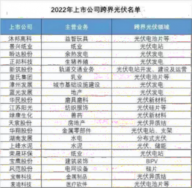 資本是“逐利”的,如此多的企業(yè)紛紛跨界光伏也是不足為怪的。根據(jù)財(cái)聯(lián)社統(tǒng)計(jì)2022年有20家上市公司跨界光伏,其涉及領(lǐng)域五花八門,有紙業(yè)、生豬養(yǎng)殖、軌道交通、獸藥、水泥、建筑裝飾、醫(yī)療軟件等等。具體如下: