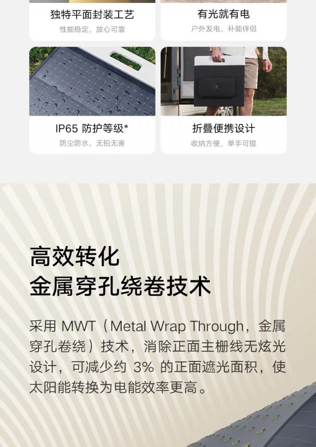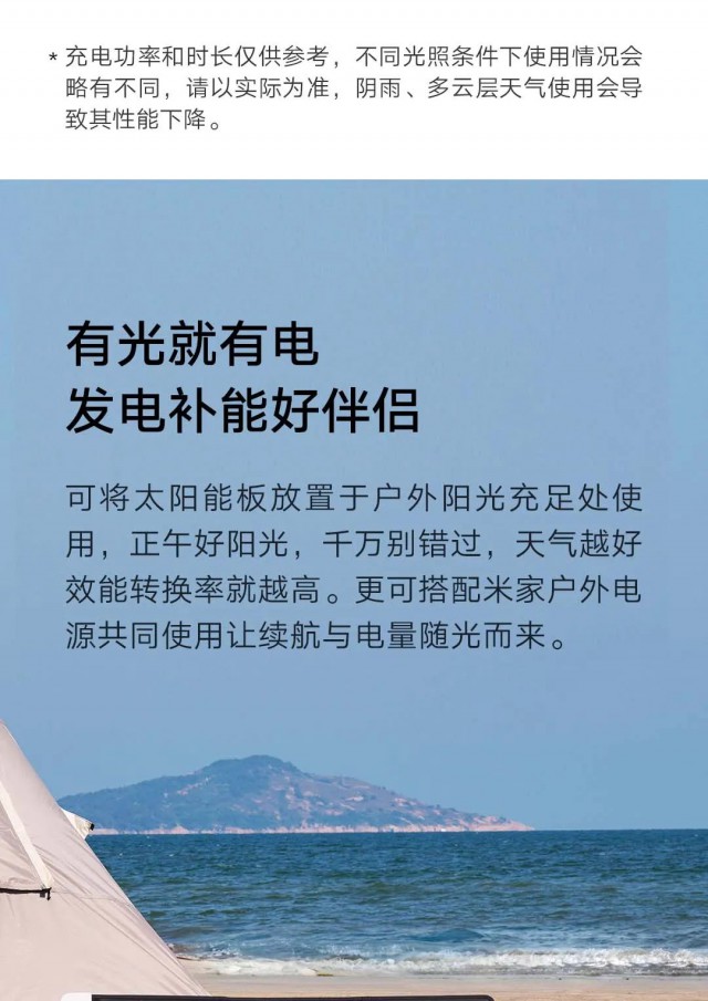 米家太陽能板100W擁有最高100W MAX大功率,可搭配戶外電源進(jìn)行快速補(bǔ)能,同時支持邊曬邊充,戶外有光就有電。