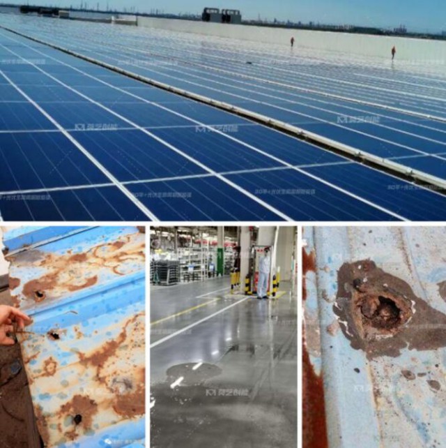 若只依靠彩鋼瓦本身的屋面,很容易因?yàn)橥繉雍穸炔粔?,加之紫外線、雨水、光合作用等自然因素的侵蝕,造成屋面彩鋼瓦接縫處開裂、鉚釘松動(dòng)生銹、屋面銹蝕擴(kuò)大、瓦脊銹蝕銹穿導(dǎo)致屋面出現(xiàn)滲水漏水的情況。同時(shí)因其坡度小,可能會(huì)造成雨水排泄不暢、積水超過彩鋼瓦接縫高度或鉚釘孔高度及溝沿瓦而導(dǎo)致銹損滲漏。而工廠生產(chǎn)過程中排放的酸性、堿性等氣體長(zhǎng)期與屋面接觸,也會(huì)腐蝕鋼結(jié)構(gòu),加速銹蝕、穿孔導(dǎo)致滲漏。
