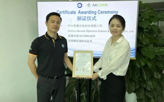 碳中和作為人類應(yīng)對氣候變化的共識,受到世界各國的廣泛關(guān)注,越來越多的國際市場推出碳相關(guān)的綠色認(rèn)證準(zhǔn)入要求。法國是歐洲市場較早提出針對光伏組件碳足跡要求的國家,擁有特有的流程和成熟的政策框架。此次愛康光電獲得的法國碳足跡ECS證書,取得了近400kg eq CO2/kWc的碳值表現(xiàn),在業(yè)內(nèi)極具競爭力,對于愛康光電的產(chǎn)品推廣與法國市場布局具有極其重要的戰(zhàn)略意義。