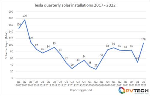 (特斯拉2017Q1-2022Q2太陽能設(shè)備安裝量 圖源:PVTECH)