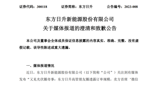 雖然朋友圈留存的時(shí)間不長(zhǎng),但其內(nèi)容還是被有關(guān)媒體捕捉到并迅速曝光。就此,東方日升于1月12日就相關(guān)媒體報(bào)道發(fā)布澄清和致歉公告,將涉及的有關(guān)言論的具體情況、公司儲(chǔ)能業(yè)務(wù)訂單情況及電池組件非硅成本情況進(jìn)行了說(shuō)明。公告稱(chēng)“莊英宏發(fā)布的相關(guān)言論均系其個(gè)人行為,不代表公司立場(chǎng)。”“莊英宏所述‘23年在手已簽4吉瓦時(shí)多了’為其與公司儲(chǔ)能業(yè)務(wù)相關(guān)同事交流了解后作出的個(gè)人理解,口徑為公司雙簽訂單量與意向在談?dòng)唵瘟康暮喜⒘俊?rdquo;