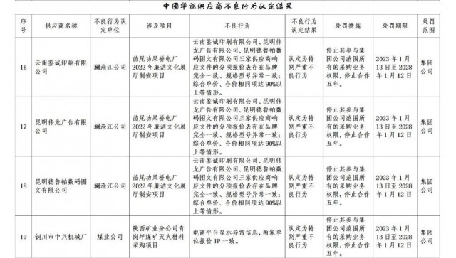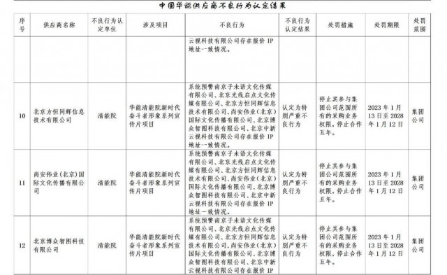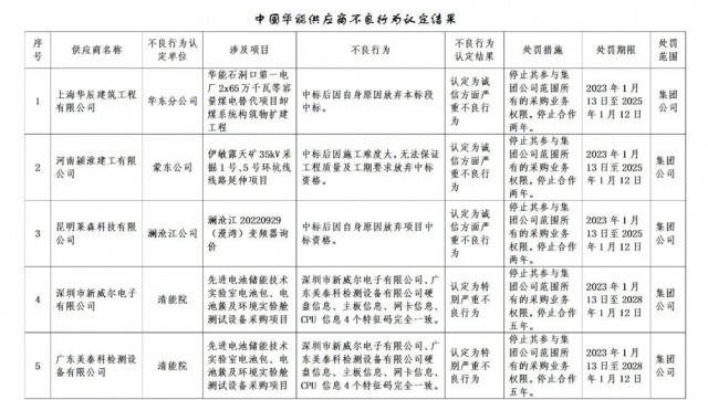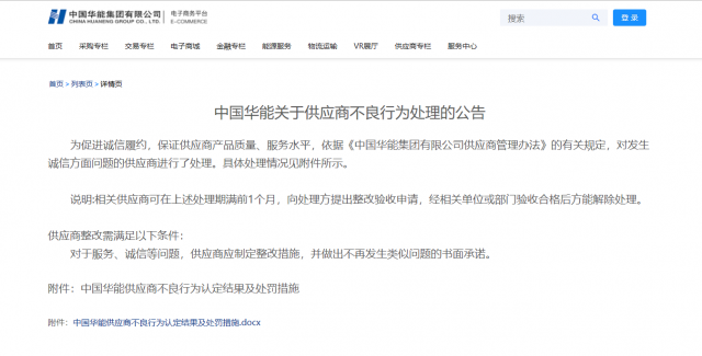 公告稱:為促進誠信履約,保證供應商產(chǎn)品質(zhì)量、服務水平,依據(jù)《中國華能集團有限公司供應商管理辦法》的有關規(guī)定,對發(fā)生誠信方面問題的供應商進行了處理。