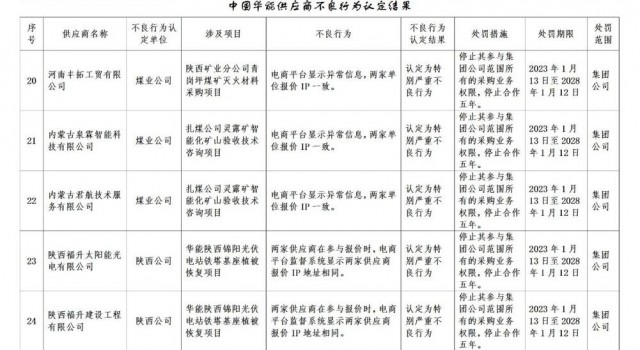 1月30日,華能集團發(fā)布《關于供應商不良行為處理的公告》,共處罰27家企業(yè)。其中包括3家光伏相關公司。