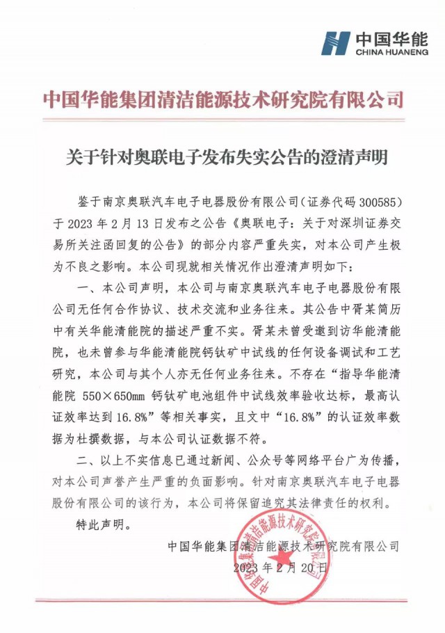 華能清潔能源研究院發(fā)布針對奧聯(lián)電子發(fā)布失實公告的澄清聲明,公司聲明,公司與南京奧聯(lián)汽車電子電器股份有限公司無任何合作協(xié)議、技術交流和業(yè)務往來。
