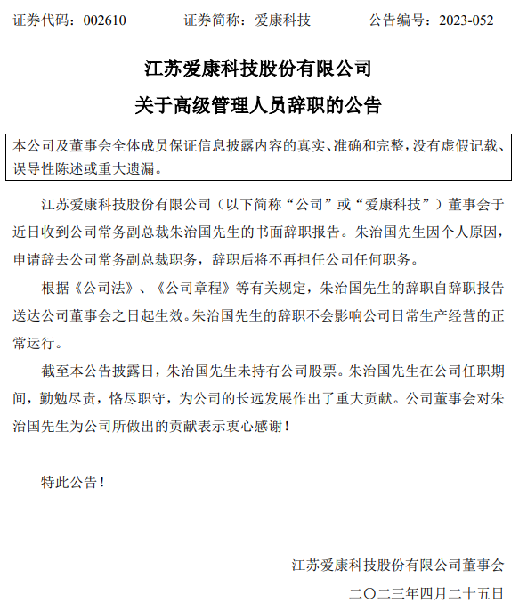 4月24日,愛康科技(002610.SZ)發(fā)布公告稱:董事會(huì)于近日收到公司常務(wù)副總裁朱治國(guó)先生的書面辭職報(bào)告。朱治國(guó)先生因個(gè)人原因,申請(qǐng)辭去公司常務(wù)副總裁職務(wù),辭職后將不再擔(dān)任公司任何職務(wù)。