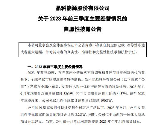 晶科能源公告稱,1-9月實(shí)現(xiàn)組件總出貨量超過(guò)52GW,其中N型組件出貨占比約為57%;截至2023年三季度末,公司光伏組件全球累計(jì)出貨量已超過(guò)190GW。