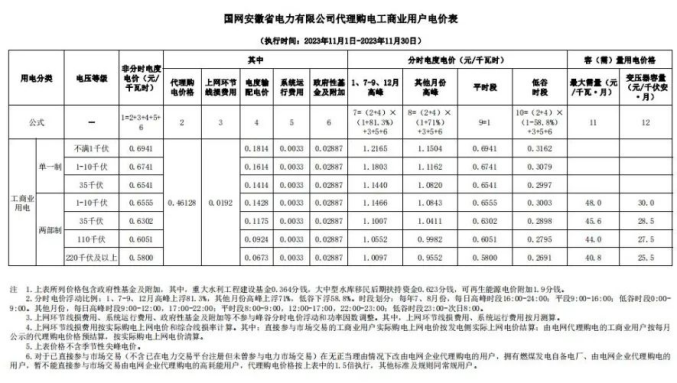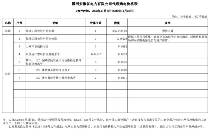 近日,安徽電網(wǎng)有限責(zé)任公司公布了安徽省2023年11月電網(wǎng)代理購(gòu)電價(jià)格,為0.46128元/千瓦時(shí),環(huán)比上月持平。