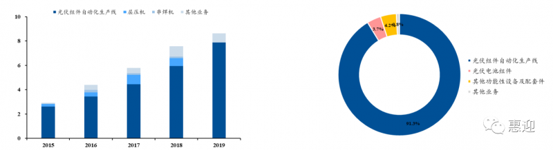 多主柵串焊機(jī)逐步成為公司光伏設(shè)備中的主要構(gòu)成產(chǎn)品。2018 年,公司多主柵串焊機(jī)開(kāi)始放量,在公司光伏設(shè)備收入中占比約為 5.88%,2019 年,公司多主柵串焊機(jī)收入從 0.2 億元提升至 2.52 億元,占光伏設(shè)備收入中的 40.91%,超越常規(guī)串焊機(jī),成為公司光伏設(shè)備業(yè)務(wù)中占比最高的業(yè)務(wù),成為公司的營(yíng)業(yè)收入中占比最高的業(yè)務(wù)。未來(lái),公司的串焊機(jī)有望深度受益于光伏組件技術(shù)迭代,在新一輪市場(chǎng)擴(kuò)展中占據(jù)優(yōu)勢(shì)地位。