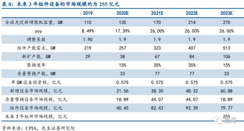 經(jīng)民生證券測(cè)算,預(yù)計(jì) 2021 年、2022 年、2023 年組件設(shè)備的市場(chǎng)規(guī)模可分別達(dá)到 82.42 億元、92.39 億元和 79.77 億元,未來(lái) 3 年組件設(shè)備的市場(chǎng)規(guī)模合計(jì)可達(dá) 255 億元,組件設(shè)備廠商擁有廣闊的發(fā)展前景。
