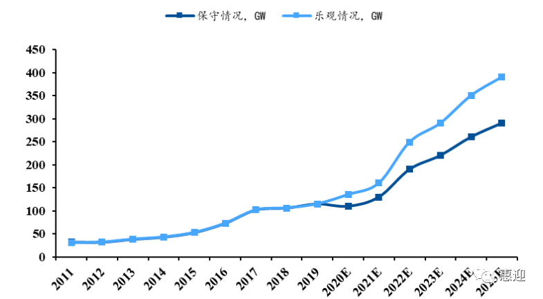 光伏行業(yè)降本提效穩(wěn)步推進(jìn),疊加全球各國(guó)可再生能源政策的頒布與執(zhí)行,預(yù)計(jì)全球光伏累計(jì)裝機(jī)容量將繼續(xù)保持增長(zhǎng)態(tài)勢(shì),根據(jù) CPIA 的預(yù)測(cè),“十四五”期間,樂(lè)觀預(yù)期下,全球光伏裝機(jī)規(guī)模年均新增 287GW,中性情況下年均新增 222GW。該預(yù)期與 IRENA 于 2019 年年在分析報(bào)告《光伏的未來(lái)》給出的預(yù)測(cè)基本一致,IRENA 認(rèn)為,到 2030 年光伏的裝機(jī)目標(biāo)將達(dá)到 8500GW,年均光伏新增規(guī)模將超過(guò) 250GW。