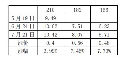 N型方面,210硅片漲幅較小,接近4%,182和166尺寸漲幅分別為7.46%、7.70%。