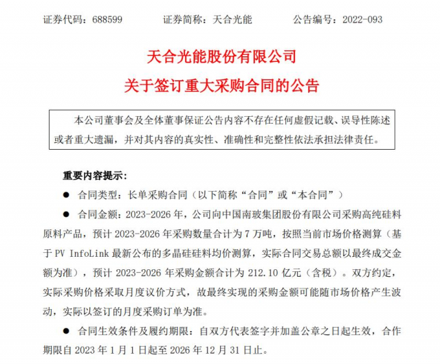 9月13日,天合光能(SH:688599)發(fā)布公告,公司與中國南玻集團股份有限公司(證券簡稱:南玻A;證券代碼:SZ:000012)簽訂高純硅料長單采購合同。合同約定,2023-2026 年間,天合光能擬向南玻集團采購7萬噸高純硅料原料產(chǎn)品,按照當前市場價格測算,采購金額約為212.10億元(含稅)。