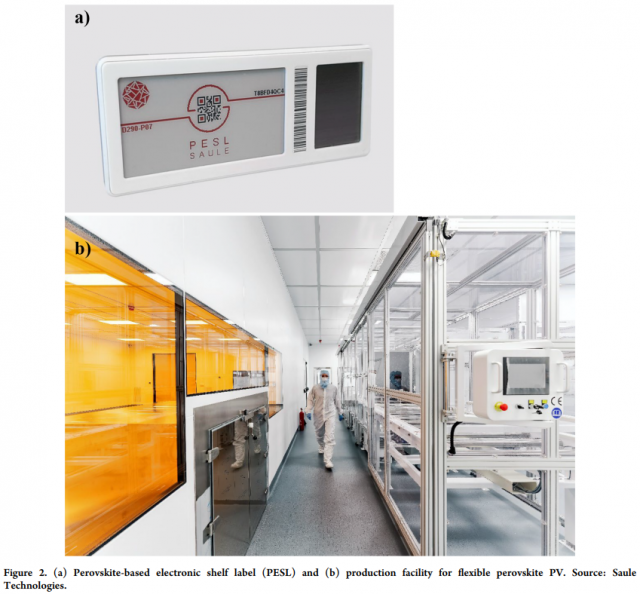 市場(chǎng)規(guī)模和增長(zhǎng)當(dāng)然不是唯一需要考慮的重要方面。從制造商的角度來(lái)看,開(kāi)發(fā)定制量最少的產(chǎn)品很重要,因?yàn)檫@會(huì)帶來(lái)額外的風(fēng)險(xiǎn)和成本。此外,如何將額外的功率預(yù)算貨幣化是非常重要的。考慮到所有這些,電子貨架標(biāo)簽似乎是最有吸引力的選擇之一。Saule 開(kāi)發(fā)的基于鈣鈦礦的電子貨架標(biāo)簽 (PESL) 的示例和用于制造柔性鈣鈦礦 PV 的試點(diǎn)生產(chǎn)設(shè)施如圖 2 所示。