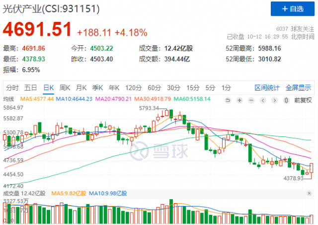 10月12日,早盤全線跳水的光伏板塊午后“遭”暴力拉升,中證光伏產(chǎn)業(yè)指數(shù)(CSI:931151)大漲4.18%,全日振幅高達(dá)6.95%,個(gè)股紛紛走出“金針探底”形態(tài)。