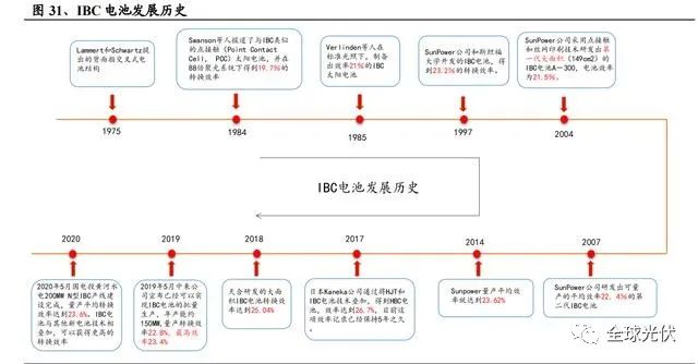IBC 電池發(fā)展歷史:IBC 電池早最是由 Lammert 和 Schwartz 在 1975 年提出 的背面指交叉式電池結(jié)構(gòu)。美國的 Sunpower 公司是 IBC 電池的領(lǐng)軍者和開拓者, 2014 年其量產(chǎn)平均效率就達到 23.62%,2015 年實驗室效率達到 25.2%;2018 年 天合研發(fā)的大面積 IBC 電池轉(zhuǎn)換效率達到 25.04%;2019 年 5 月中來公司宣布已 經(jīng)可以實現(xiàn) IBC 電池的批量生產(chǎn),年產(chǎn)能約 150MW,量產(chǎn)轉(zhuǎn)換效率 22.8%,最高效率 23.4%。2020 年 5 月國電投黃河水電 200MW N 型 IBC 產(chǎn)線建設(shè)完成,量產(chǎn)平均轉(zhuǎn)換效率達到 23.6%。IBC 電池與其他新電池技術(shù)相疊加,可以獲得更高的 轉(zhuǎn)換效率,2017 年 3 月,日本 Kaneka 公司通過將 HJT 和 IBC 電池技術(shù)疊加,得 到 HBC 電池,效率達到 26.7%,目前這項效率記錄已經(jīng)保持 5 年之久。
