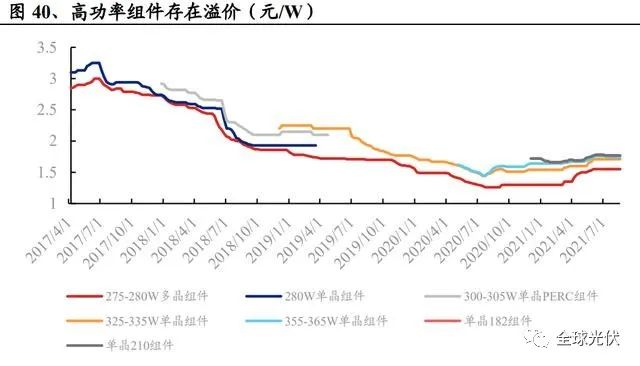 從最終組件端綜合成本來看,當(dāng)前 P-IBC 電池已經(jīng)具備成本優(yōu)勢,TOPcon 成本較 PERC 稍高,HJT 電池成本還需進一步下降。溢價:TOPcon 高效組件產(chǎn)品溢價約為 0.1 元/W。新型產(chǎn)品性價比除了考慮 絕對成本優(yōu)勢外,還需考慮高功率溢價優(yōu)勢。參考PVinfolink數(shù)據(jù),2017-2020年 間,單晶組件相對于多晶組件長期保持 8%-10%的價格溢價,大尺寸(182及 210) 高功率組件產(chǎn)品相對于常規(guī)功率組件也能保持一定溢價。