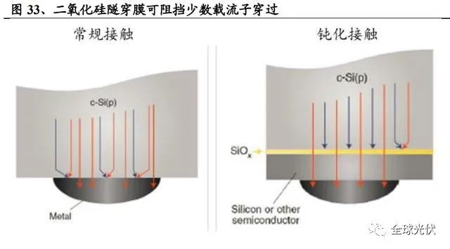 二氧化硅+摻雜多晶硅:隧穿作用和鈍化作用。二氧化硅隧穿膜最佳厚度在 1.2nm,其作用在于使多數(shù)載流子(電子)通過隧穿效應(yīng)穿過氧化層,但少數(shù)載流 子(空穴)被阻擋,從而進一步降低了載流子復(fù)合效應(yīng)。摻雜多晶硅層一方面起到保護二氧化硅層的作用,另一方面會增加電子或空穴在氧化硅中的隧穿概率, 因此,多晶硅層的摻雜濃度越高,太陽能電池的開路電壓和效率就越高。